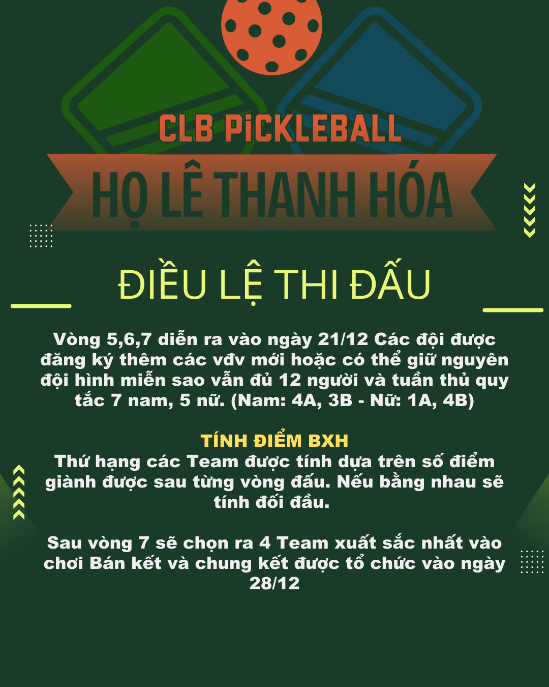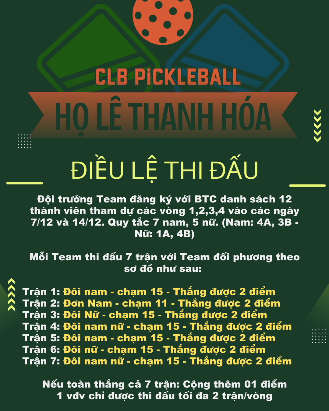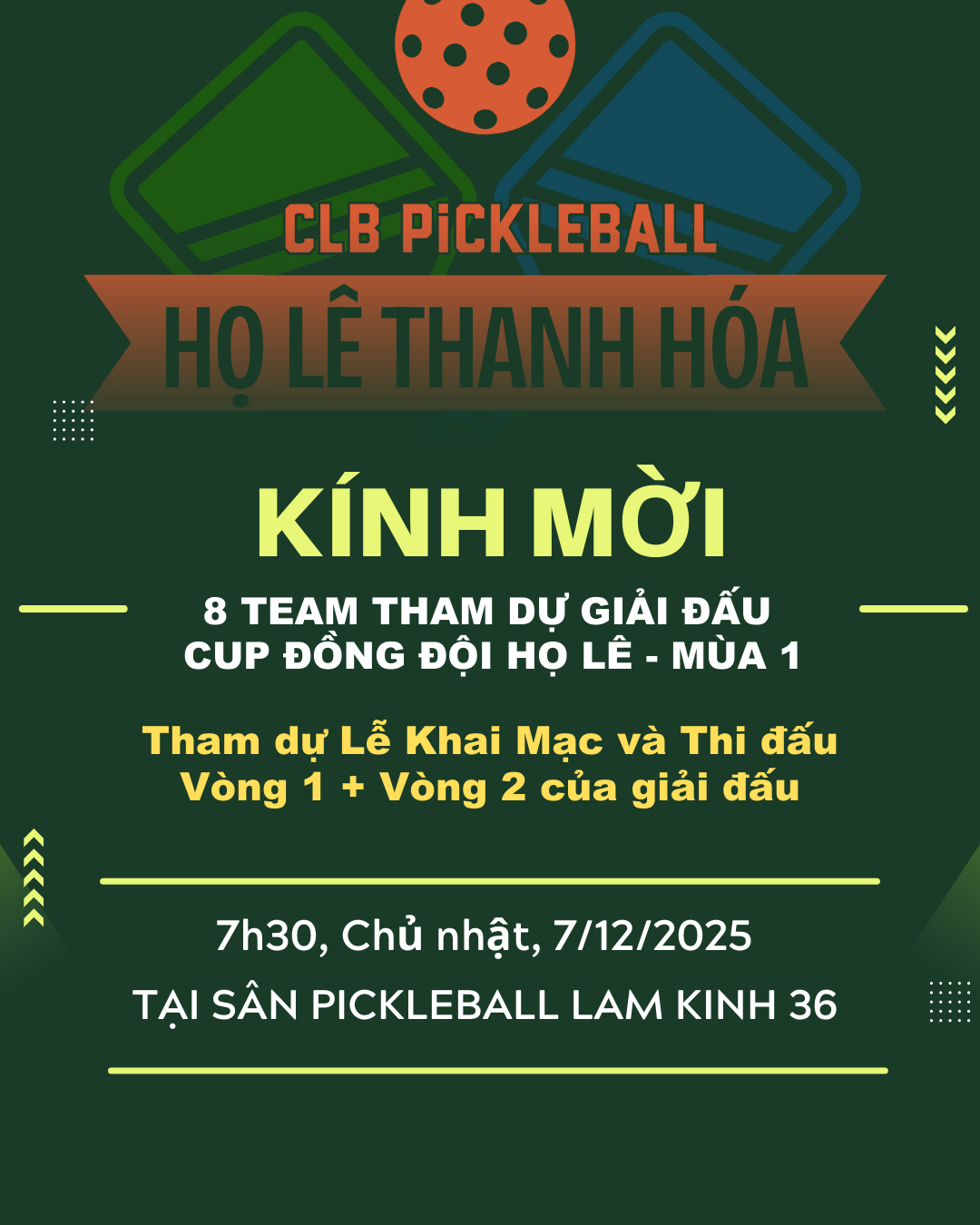 Khai mạc vào ngày 7/12/2025 và Bế mạc vào ngày 28/12/2025 tại Sân Lam Kinh 36. Giải Pickleball Cup Đồng Đội họ Lê Thanh Hóa là giải đấu đồng đội đầu tiên được tổ chức với quy mô gồm 8 đội tham dự, mỗi đội có từ 10 đến 17 vận động viên. Đây được xem là thể thức mới lạ hấp dẫn và hiện đang tạo sự tò mò của các vận động viên. Hiện tại Ban tổ chức đang tiến hành những bước cuối cùng trước khi chính thức bước vào tranh tài!